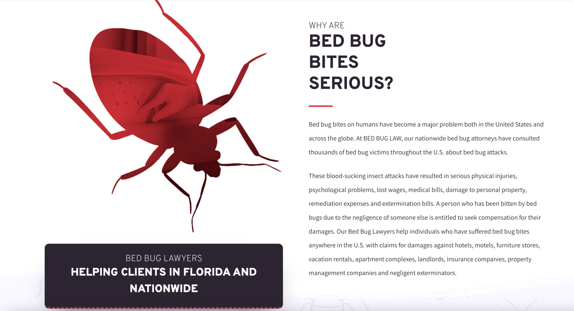 Our mission is to help individuals who have suffered from bed bug bites due to negligence, ensuring they receive the compensation they deserve for their damages. We offer legal representation for clients who have been affected by bed bug bites, assisting them with claims against hotels, motels, furniture stores, vacation rentals, apartment complexes, landlords, insurance companies, property management companies, and negligent exterminators. Our experienced attorneys have been handling injury claims since 1979, and we are dedicated to protecting our clients from insurance companies that attempt to downplay the seriousness of bed bug injuries.