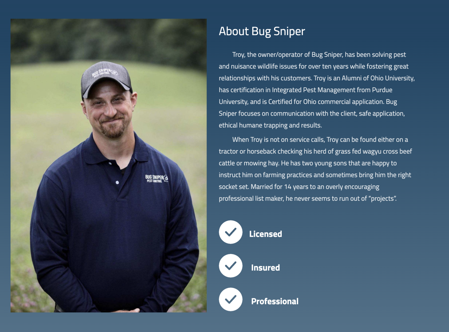 Our mission is to provide effective and humane pest and wildlife control solutions to ensure the safety and comfort of our clients' homes and businesses. We offer comprehensive pest control services for both residential and commercial properties, targeting a wide range of pests including stinging insects, carpenter bees, ants, bed bugs, cockroaches, mosquitoes, and ticks. Additionally, we provide nuisance wildlife trapping services for raccoons, possums, skunks, squirrels, groundhogs, and more, along with emergency wildlife removal from interiors.